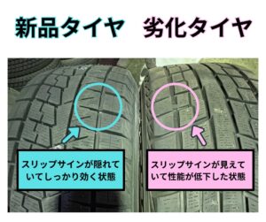スリップサインとタイヤの表面が同じ高さになっていたら交換の目安です!!